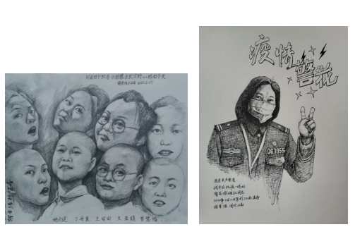 ○支援宜城抗疫的辽宁医疗队四名美女护士为工作和自卫方便将秀发剃成了光头,胡香强将前后合影的照片画在一张纸上。
