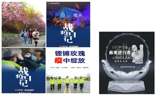 ○吴光山报道:“战地玫瑰”分外香,介绍了团市委书记莫钰、市巡察办主任赵莉莉、市妇联副主席余兰、市技工学校女教师李爱华、退休工人叶红的防疫故事。//郑新涛报道: “白酒女王”陈金凤、“餐饮领袖”郭红梅、“蛋糕皇后”张怡。其中张怡为义工、志愿者、长贺西饼食品公司总经理,为红十字会捐赠物资、向慈善总会捐款,还赠予辽宁援宜医疗队员糕点礼盒及百合花。