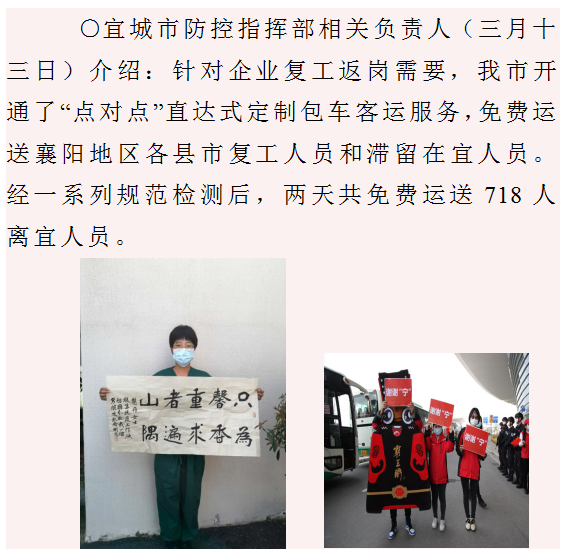 ○宜城市防控指挥部相关负责人(三月十三日)介绍:针对企业复工返岗需要,我市开通了“点对点”直达式定制包车客运服务,免费运送襄阳地区各县市复工人员和滞留在宜人员。经一系列规范检测后,两天共免费运送718人离宜人员。