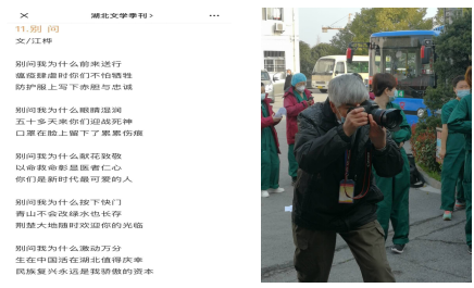 一个多月来,点开“宜城文艺界”公众号,一篇篇美文,一幅幅书法、一张张图片,或激人奋进,或催人泪下, 市作协、书协、美协、摄协等协会以 “战疫”故事和典型人物为创作素材的文艺作品。“宜城文艺界”编发了三十多期公众号,一期《沧浪》特刊,本级媒体及向上推介发表了近400件抗疫文艺作品。