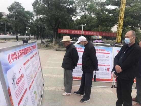 本网讯记者易振波 通讯员宗思诗报道:5月18日,宜城市司法局联合市信访局、市妇联在紫盖山广场开展“美好生活·民法典相伴”宣传活动。