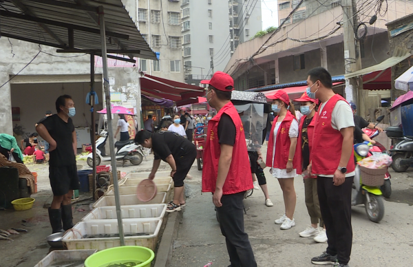 黎向阳是七里花园社区党委书记,疫情形式严峻之后,他每天从早7点到晚10点在全社区到处跑,统筹整个社区的疫情防控工作,同时也亲自到一线当志愿者做服务,当好带头人。8月11日这天,他和社区志愿者们来到了中华路农贸市场,督促商户和群众打疫苗、戴口罩、不聚集,做好防疫措施。