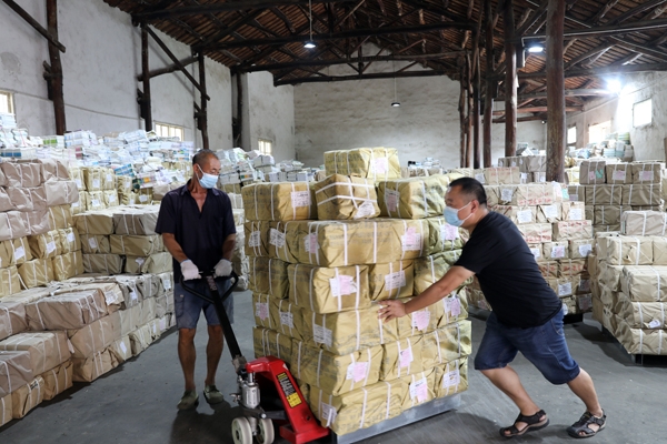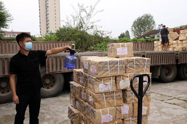 当天,记者在新华书店仓库看到,工作人员汗流浃背地装卸、搬运教材,入库前严格做好教材的消杀,现场一片忙碌的景象。