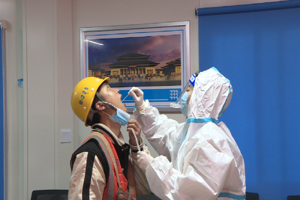 在四馆两中心建设项目现场,工作人员正在引导工人们保持一米线的安全距离有序排队,依次进行核酸采样工作 ,还对预登记和健康码显示有困难的工人一一做好服务,确保项目建筑工人"应做尽做"。