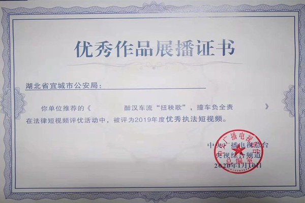 本网讯记者刘毅通讯员徐桂红 陈莉报道:日前,中央电视台今日说法栏目组织的“2019年度全国优秀普法短视频”评选活动揭晓,宜城公安制作的短视频《醉汉车流“扭秧歌” 撞车负全责》获评全国“优秀执法短视频”。