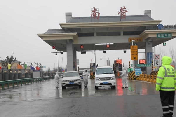 1月25日,医务人员和公安干警坚守在高速路口,对外来人员进行健康检测,做好疫情防控宣传工作。