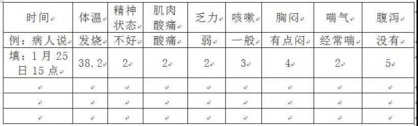表格备注:除了体温,其他的填数字1~5,1是感觉受不了,非常难受或者非常差,5是完全好转。如果都是5,那就好了,如果和之前比很多数字变小了,或是某一项到1了,就要赶紧联系医生了。