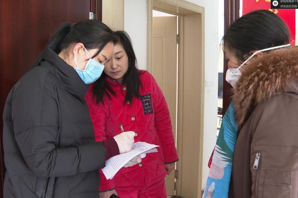 1月27日,我市社区工作人员逐家住户进入居民家中进行登记排查,对有返乡人员家庭进行体温检测。