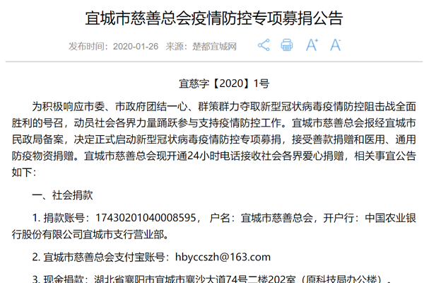 近期发生的新型冠状病毒感染的肺炎疫情防控形势十分严峻,宜城医疗物资匮乏,1月26日,宜城市通过网站、电视、微信公众号等媒体,发出疫情防控专项募捐公告,动员社会各界力量踊跃参与支持疫情防控。经市慈善总会等部门广泛发动,市企业家协会积极行动,发挥“一方有难、八方支援”的精神,支持党和政府打赢这场没有硝烟的战争,积极开展捐款捐物。