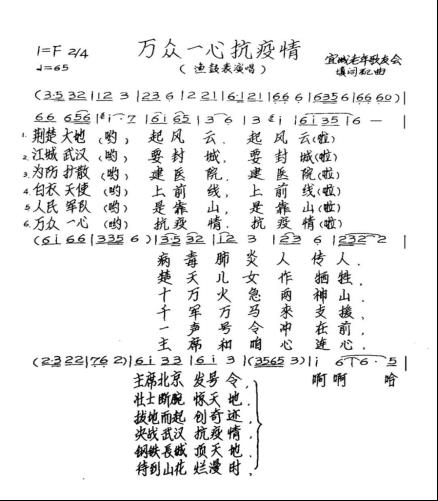 曾照元老人是宜城歌友会的负责人,现在已是杖朝之年,面对这次突如其来的疫情,他用自己独特的方式投身到抗击疫情中,携团队创作了《万众一心抗疫情》《全民抗病疫》《阳光总在风雨后》等一批以抗“疫”为主题的文艺作品,唱响主旋律,宣传正能量,为疫情防控助威呐喊,受到了观众的喜爱。
