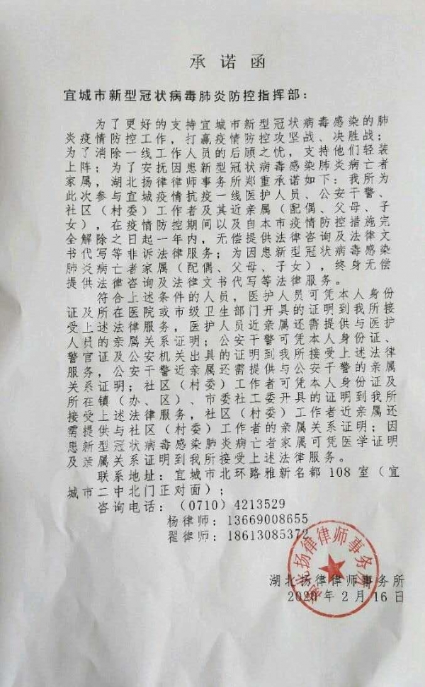 据了解,湖北扬律律师事务所将在疫情防控期间以及自疫情防控措施完全解除之日起一年内,为参与抗疫一线的医护人员、公安干警、社区(村委)工作者及其近亲属无偿提供法律咨询及代写法律文书等非诉法律服务;为因患新型冠状病毒感染肺炎病亡者家属(配偶、父母、子女),终身无偿提供法律咨询及法律文书代写等法律服务。