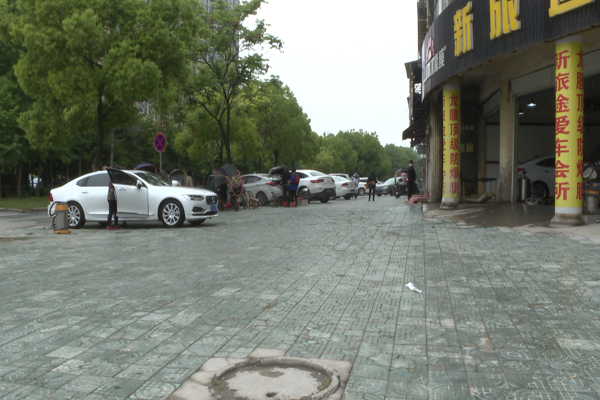4月21日早上,记者来到现场看到,洗车店、早餐店门口横七竖八的停有多辆私家车,还不停的有车辆来往,将这段路堵得严严实实。人行道上的地砖大部分已破损,还有不少的坑坑洼洼。因为刚下过雨,破碎的地砖缝里全是泥水,行人走在上面都是小心翼翼的。