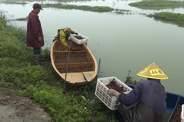 在楚绿公司虾塘记者看到:一大早,工人们就穿着水衣水裤,推着小船,冒雨忙着收获虾笼。两小时后,将一船船大虾运到岸边,装筐上车,运往集中分拣点。