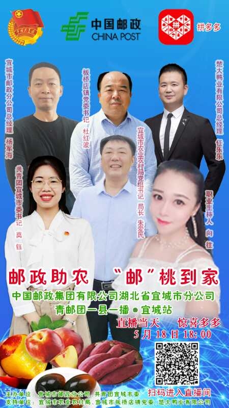 本网讯通讯员王爱斌 屈新颖报道:为解决疫情影响下宜城农产品滞销问题,中国邮政宜城分公司将于5月18日晚6:00发起助农“邮”惠公益直播活动。你只需微信识别二维码后打开“拼多多” 就能实时进行观看。