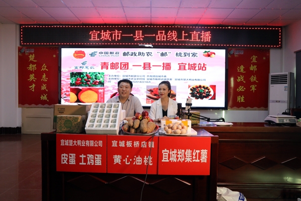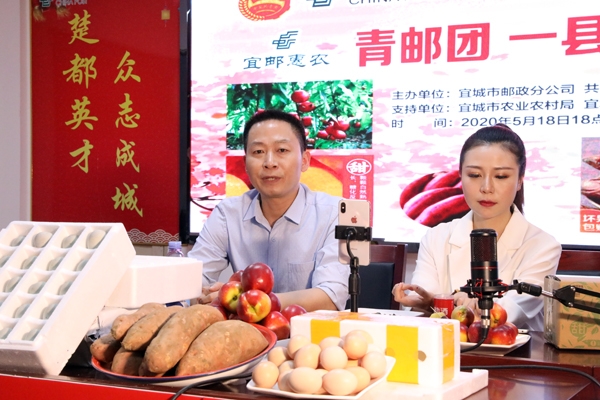 宜城市农业农村局局长朱爱民、共青团宜城市委书记莫钰、中国邮政宜城分公司总经理杨军海、板桥店镇党委书记杜红波等代言人带着郑集的松花皮蛋和土鸡蛋,板桥店的油桃、红薯等农产品来到直播现场,向网友和观众推介。