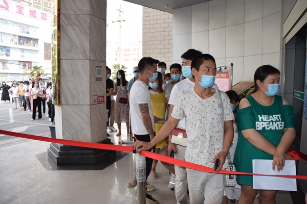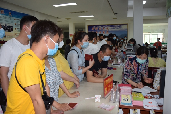 早上9点,市行政审批局大厅门口,前来领证的新人们早已排起了长长的队伍。为了避免现场办理聚集扎推,所有人员必须佩戴口罩,扫码测体温,分批次有序进入。
