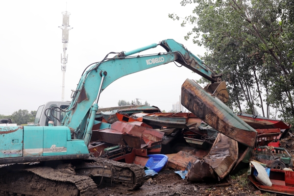 吊车挥舞长臂报废渔船