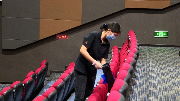 7月30日上午,记者在宜城市大地影院看到,工作人员正在对大厅、走廊、影厅等重点区域进行清洁消毒,为明天营业做最后的准备。