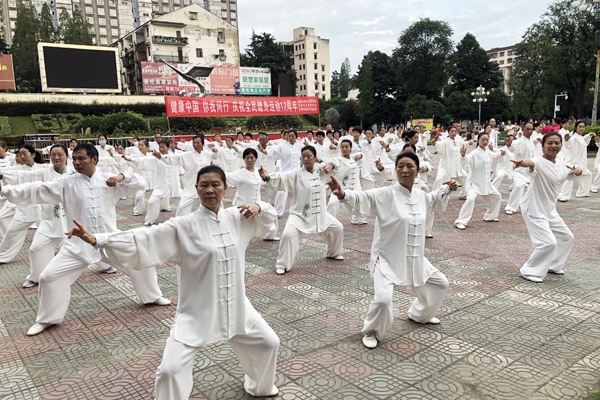 在紫盖山广场主会场,现场展演了《健身气功八段锦》《八式太极拳》《陈式太极拳》等10多个健身节目,以及曲剧、京剧等文艺节目。