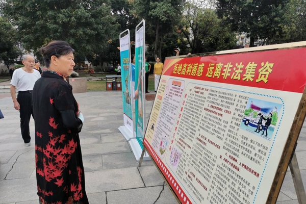 活动现场,工作人员通过悬挂横幅、设置展板、循环播放广播、发放宣传资料、现场答疑解惑等方式,向公众宣传讲解非法集资的定义、特征、表现形式以及参与非法集资应承担的法律责任。郑重提醒广大群众:“高收益意味着高风险”、“投资有风险 风险要自担”,要“守住钱袋子 护好幸福家”。
