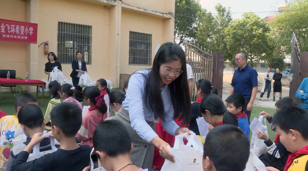 本网讯记者刘毅报道:9月30日,共青团宜城市委联合长贺西饼公司到郑集镇金飞环希望小学,看望该校留守儿童,为他们送去爱心月饼,圆梦“微心愿”,向孩子们表达了节日问候。