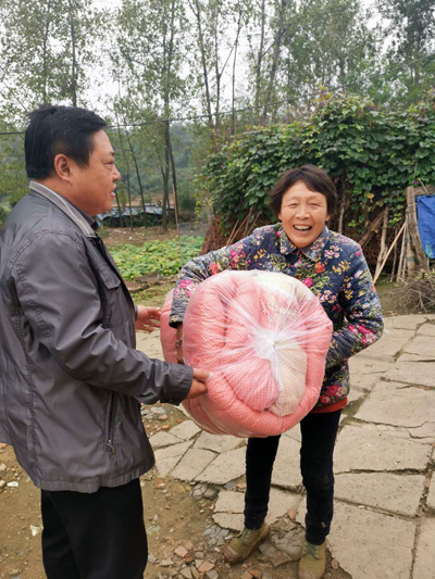 本网讯通讯员王泽宇 丁雪婷报道:10月13日,宜城市总工会开展“结对帮扶大走访”活动,为孔湾镇钟岗村贫困户送去过冬棉衣棉被。