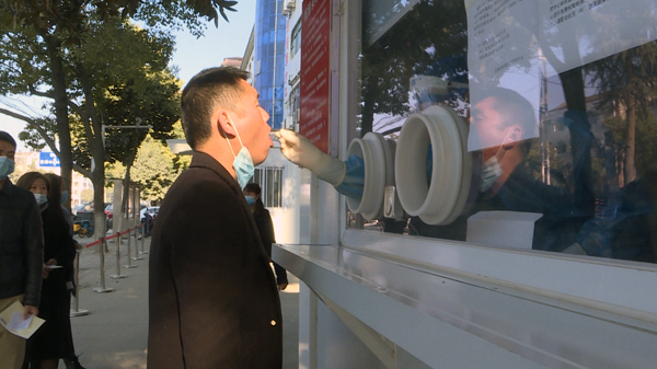 2月19日,记者在市疾控中心看到,核酸检测点再次排起了长队,前来参加核酸检测的市民在通过体温监测等防疫措施后,有序进入核酸检测区,配合工作人员进行咽拭子采集。