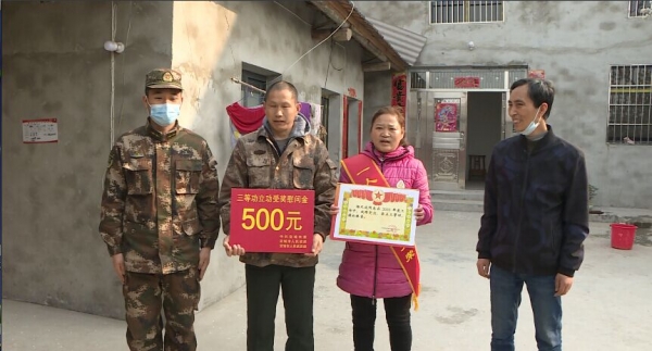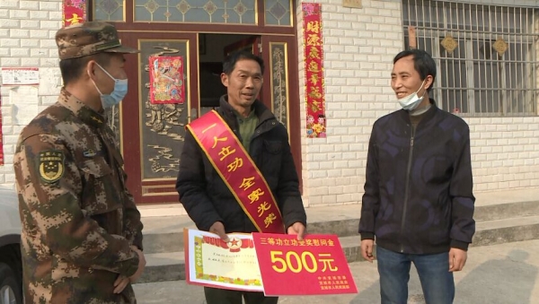 当天,宜城市人武部、市退役军人事务局及相关镇(办)敲锣打鼓来到现役军人吴亚运等四人现役军人家中,送上三等功喜报、“三等功臣之家”牌匾和500元奖励金,并询问其家庭生活情况,转达市委、委政府对军人军属的关怀。