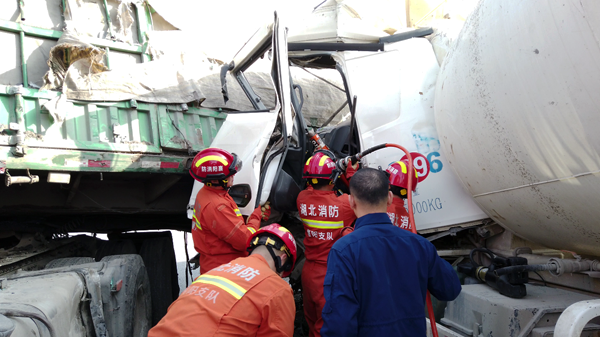 本网讯记者钟军 刘毅通讯员王耀文报道:3月3日下午3时许,宜城市某路口发生交通事故,水泥罐车司机被困在驾驶室内无法动弹。接警后,宜城市消防救援大队14名消防队员立即赶赴现场救援。