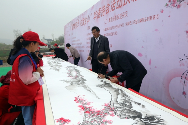 活动现场,书法家们挥毫泼墨,书写了“建党百年•花香金山”,美术家们展示了耗时多日绘制的百米桃花长卷,国家一级朗诵家刘橦朗诵了桃花诗歌,共同艺术展现了金山村美丽乡村建设文旅融合、花果飘香的丰硕成果及生态之美。