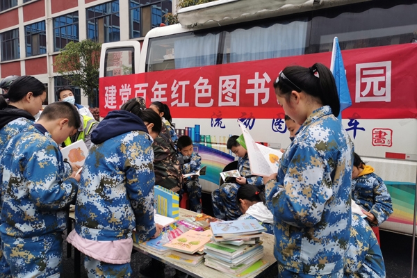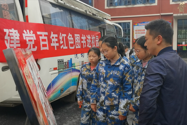 宜城图书馆为本次活动服精心挑选党史、党规、党建等红色经典书籍1000多册。活动现场,学生们围在图书车里外,开心地挑选、翻看自己喜爱的书籍,有阅读英雄故事的,有阅读中外名著和科普故事的,看的聚精会神。党史宣传展板前,也站满了师生,大家认真聆听工作人员讲述党史故事,接受红色教育。