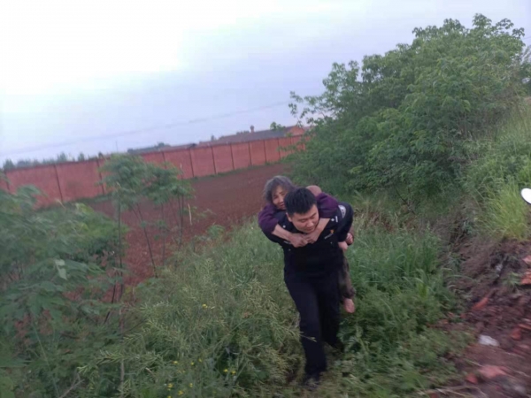 接警后,民警立即驱车赶赴现场,只见一位白发苍苍的老人正光着脚在草丛里捡树枝。民警上前询问情况,老人不说话,后经民警多次与她交流安抚,老人才提及自己是从湖北省钟祥市丰乐镇过来的,已经三天都没吃饭了。这时,民警二话没说,立即背起老人向前行走。