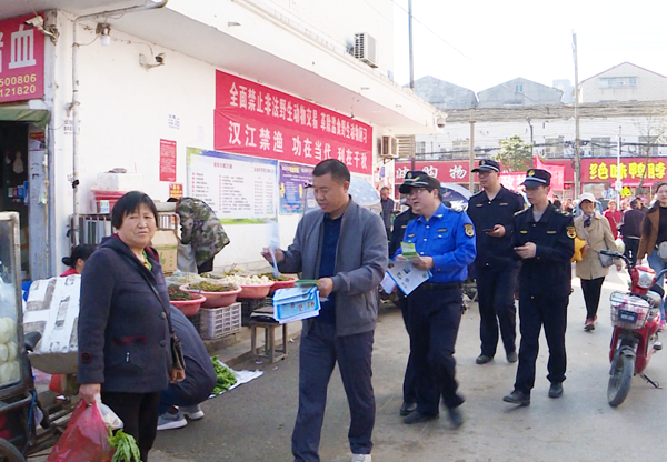 本网讯记者刘毅 钟军报道:4月29日,宜城农业综合执法大队联合市城管执法大队,在中心农贸市场开展汉江(蛮河)“十年禁渔”法制宣传活动,深入推进禁捕退捕工作。