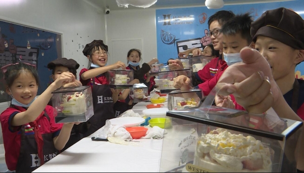 在长贺西饼的手工作坊,同学们拿起工具,当起“厨师”,体验制作蛋糕的乐趣。他们严肃认真,一丝不苟,经过努力,制作的蛋糕也是有模有样、色味兼俱。“这个蛋糕是我亲手用奶油和水果制成的,我想回家送给爷爷奶奶吃,让他们开心。”三(1)班学生李露说。