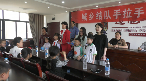 来自实验小学的金悦霖为结队的小朋友送去了地球仪和绘画作品,西街小学的艾一岑向结队的小朋友送上学习用具。