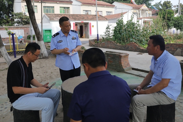 6月11日下午4 点,室外温度达33度,酷热难耐。但在王集镇槐树村四组的小广场上,赵辉和民警们仍在耐心细致地给休闲纳凉的村民发放反诈宣传资料,讲解反电诈知识。