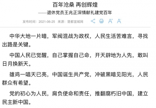 退休近20年来,王兆正仍旧不忘发挥余热,积极参加党组织的各种活动、党员学习,关心支持宜城的建设发展,先后创作了多首感恩党的诗篇。今年4月,看到宜城市委宣传部、市文联、市融媒体中心关于建党百年的征文启事后,老人就萌生了创作诗歌的想法,打算用诗歌的方式,表达一名老党员对党的热爱之情。两个多月里,老人逐字逐句反复推敲,用功用情用心至深,最终写出了《百年沧桑 走向辉煌》这首近千字的长诗。