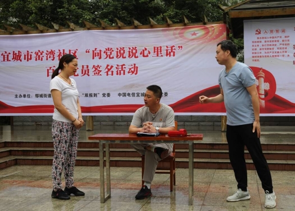 活动中,全体党员依次上台在签名墙上签名留言。宜城电信公司与格林花苑小区开展党建翼联活动,为小区提供反诈宣传、网络检测等免费服务,践行央企责任。