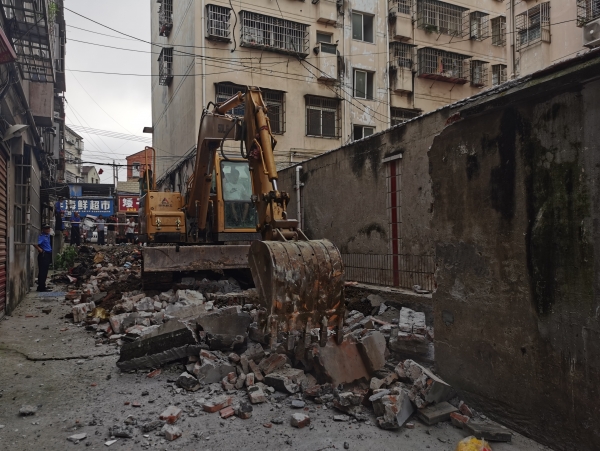本网讯记者向杰廷 通讯员彭礼辉报道:7月13日,记者在宜城市城区教场二巷看到,市城管执法大队组织的违建拆除工作正在顺利进行,狭窄的小巷子即将变宽。