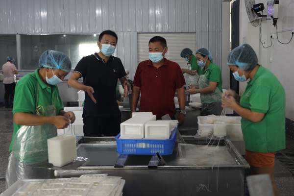 7月15日,记者在该公司包装车间看到,工人们正忙着把一卷卷葛根粉丝装盒包装。