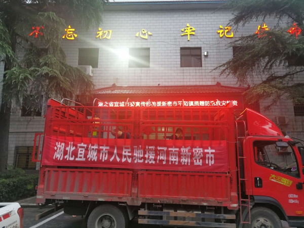 因交通管制,前往河南新密市的宜城志愿者在新密市古城县衙高速出口与新密市委宣传部负责同志对接,救援物资被顺利送到新密市平陌镇,宜城志愿者同平陌镇党员干部一起,将救援物资转运完毕。