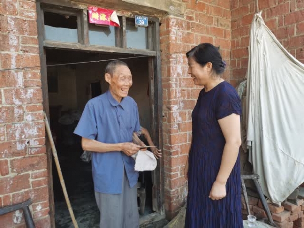 在退役军人张元发家中,黄桂芳与他亲切交谈,详细了解其参军时间、退伍时间以及退伍后的生活状况。在了解到张元发是1952年入伍,1953年抗美援朝参加了上甘岭战役,黄桂芳对 张元发为党和国家无私奉献的精神致以崇高的敬意。