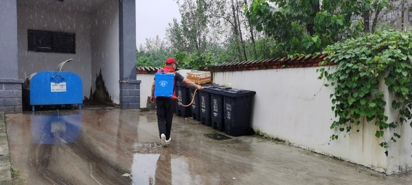 社区还组织消杀工作人员针对辖区各处积水地带、水沟、垃圾桶及卫生死角等“细菌重灾区”喷洒消毒药水,保证洪灾过后无疫情发生,全力保障社区居民的身体健康。