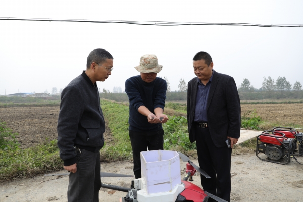 朱迎峰是原种场3组农民,2年前承包了1000亩农田,因为人工成本太高而购买了这台4翼无人机,装载量20公斤,可根据田块的面积进行精准播种,一小时能播种80多亩油菜,工作效率是人工的50 多倍,是旋耕条播机的15 倍,除了效率高,无人机飞播还具有种子撒播均匀等优点。