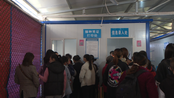 在该院接种点,儿童们正在家长的陪同下依次排队,经过扫码填表、信息录入、手部消毒等一系列操作之后,有序地进行疫苗接种。