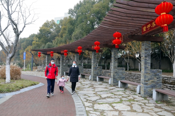 在燕京花苑,"中国心"花海分外妖娆,火红的灯笼挂满了广场的灯柱和树梢;在宜城大道,绿化带里鲜花盛开,两旁的电线杆上红红的中国结一字排开;在振兴广场小游园,一排排大红灯笼挂满了长廊,把小游园装扮得温暖、祥和。和家人一起在小游园游玩的市民刘俊杰说,"城市处处都是一片喜庆祥和氛围,象征我们的祖国繁荣昌盛,老百姓日子越过越红火。"