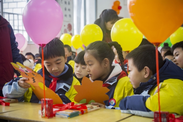 随后,学生们错峰进入班级,开启“相互送祝福”活动。每名学生的课桌上都放置有气球、旺仔牛奶、包装精美的新课本,黑板上每名学生名字旁边贴着一个棒棒糖,祝福同学们新一学年越来越棒。学生们也精心准备了心愿卡相互分享,教室里一派喜气洋洋。