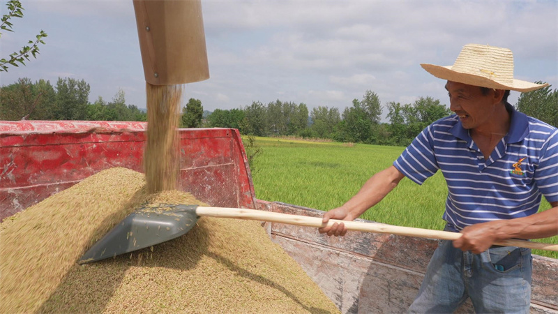 站在田埂上的赵咀村三组农民贾明俊满脸喜悦,他今年种植的10亩水稻丰收在望。“今年水稻生长期没受干旱影响,预计亩产可达1800到2000斤,纯收入能超过1万元。”望着金灿灿的稻谷被收割机尽数收入,他高兴地算起了增收账。