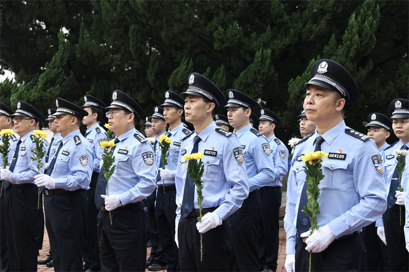 “坚决拥护中国共产党的绝对领导,矢志献身崇高的人民公安事业……”纪念碑前,青年民警代表领誓,全体民警面向警旗举起右拳,庄严重温《公安机关人民警察誓词》。铿锵誓言回荡现场,彰显出公安民警传承英烈使命、坚守初心使命的坚定决心。