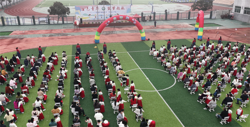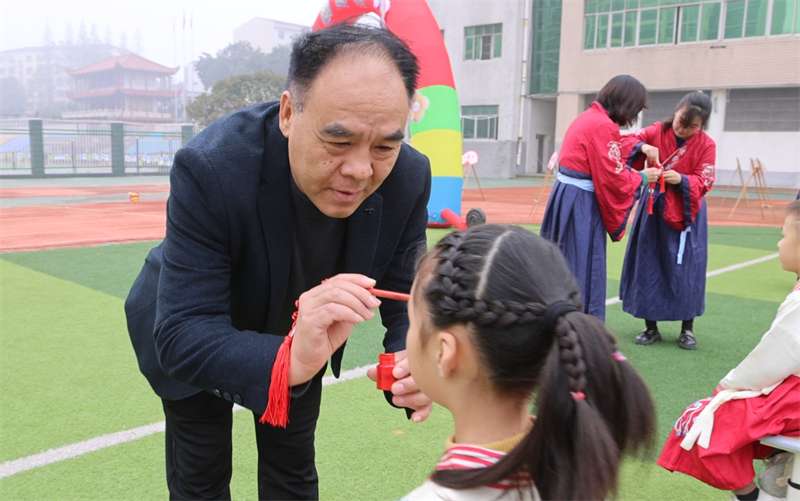“击鼓明智”环节将活动推向高潮。学校主要负责人击鼓三响,每击一响,带领学生齐呼成长誓言——“尊敬师长”“热爱学习”“为校争光”,鼓声激越,誓言铿锵。随后,各班学生代表依次击鼓,在《花灯游》的悠扬乐声中,以鼓声传递志向,现场气氛庄重而热烈。